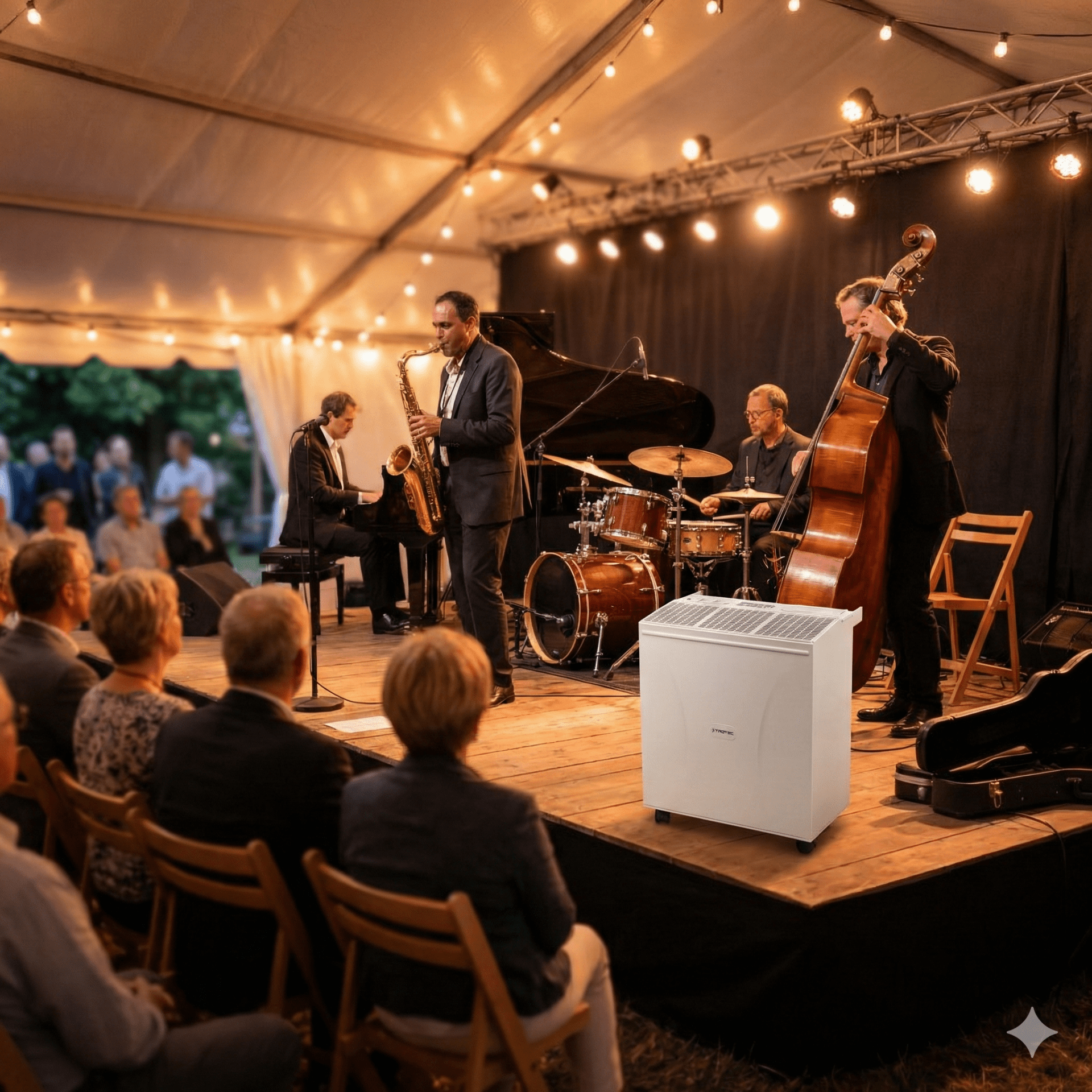 → Wir liefern passende Luftbefeuchter und installieren sie rechtzeitig vor Veranstaltungsbeginn. Die Geräte sorgen für eine optimale Luftfeuchtigkeit im Raum. Ihre wertvollen Instrumente – ob Konzertflügel, Kontrabässe oder Saxophone – sind während des gesamten Events optimal geschützt.