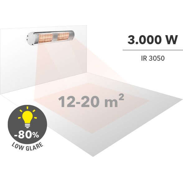 Professionelle Wärmestrahlung für große Außenbereiche – Der Infrarot-Heizstrahler IR 3050 bietet mit 3.000 Watt eine kraftvolle Heizlösung für Terrassen, Biergärten und gewerbliche Außengastronomie. Mit seiner beeindruckenden Wirkungsfläche von bis zu 20 Quadratmetern übertrumpft dieser Strahler herkömmliche 2-kW-Modelle deutlich. Die innovative Low Glare Technologie reduziert das sichtbare Licht um bis zu 80 Prozent – Sie genießen wohlige Wärmestrahlung ohne störendes orange-rotes Glühen, das Ihr Beleuchtungskonzept beeinträchtigt.