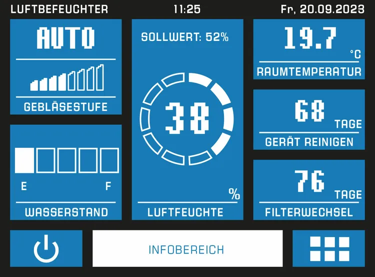 - Modernes Touchdisplay mit Anzeige von Luftfeuchte, Raumtemperatur und Gerätestatus